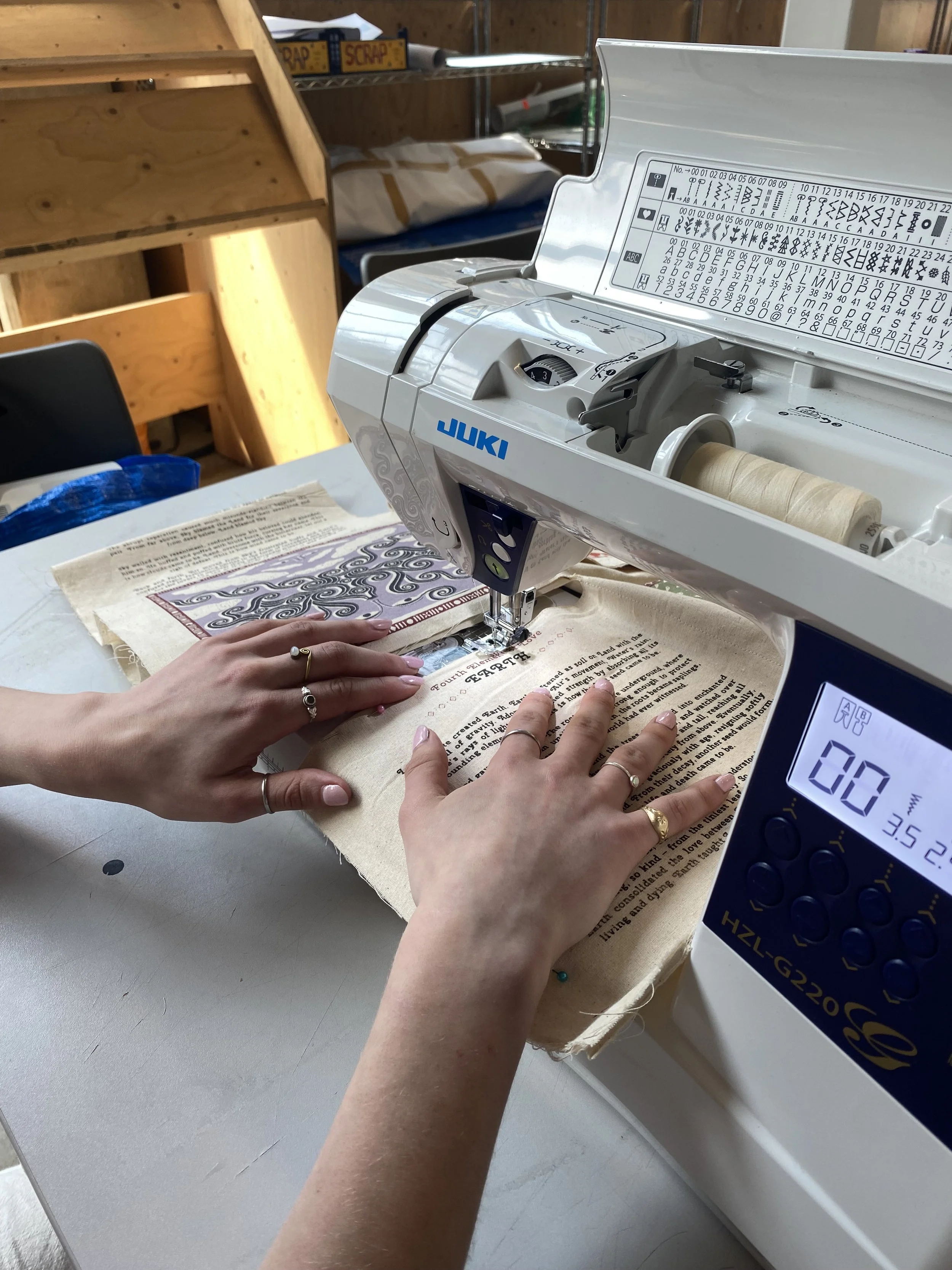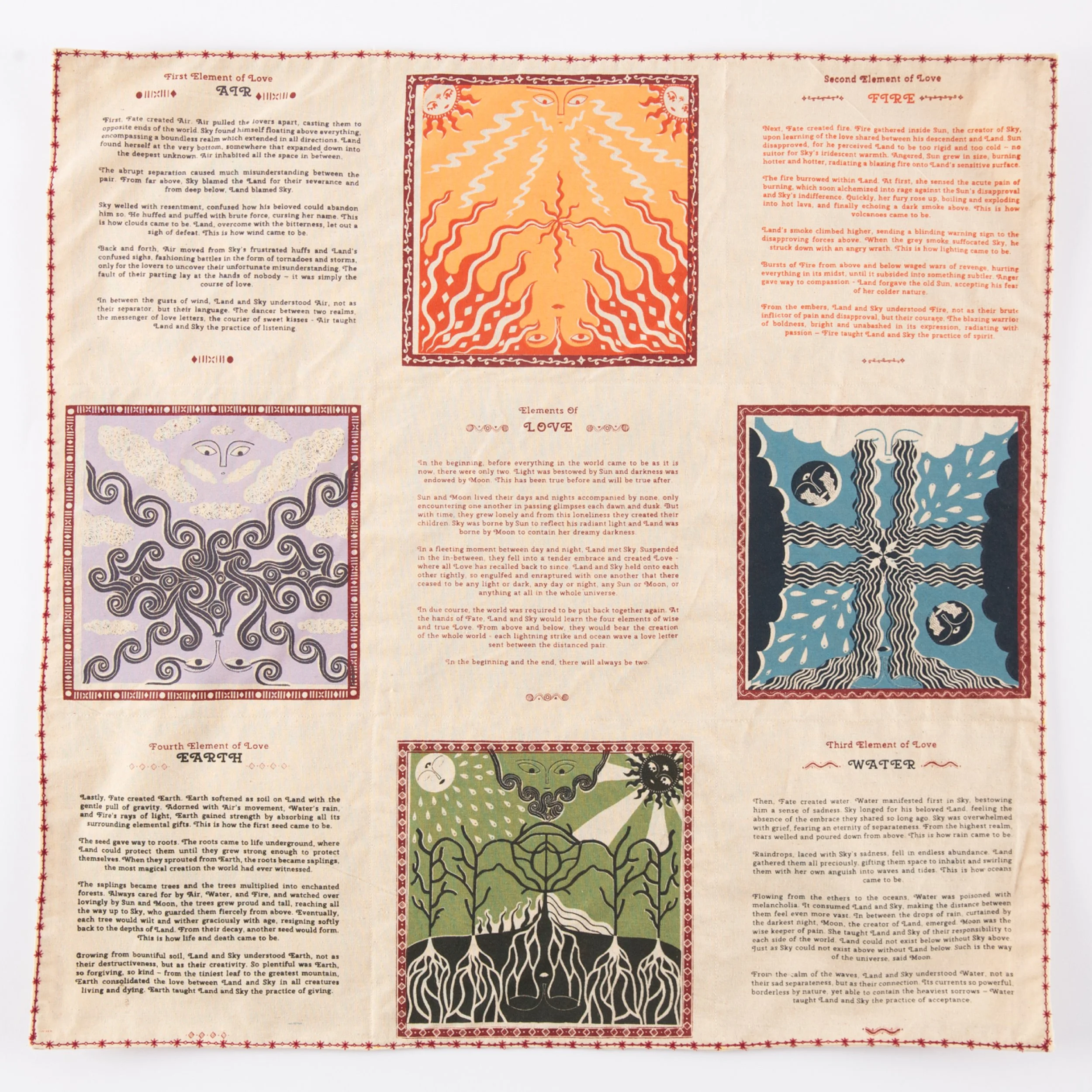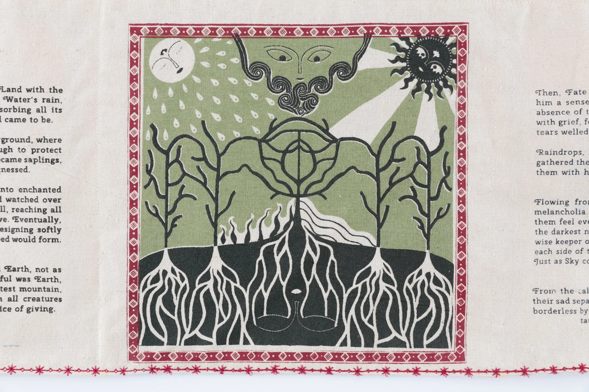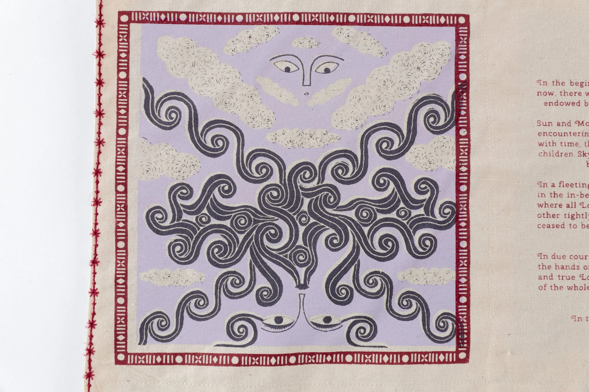 Land and Sky was created using completely handmade and cross-cultural processes: printmaking and sewing. Realised as a nine-layer silkscreen print on fabric, and embroidered into an unfolding story quilt, Land and Sky utilises the quilt as a powerful cross-cultural object of love, offering a collective mythology for all intercultural couples to feel emboldened by.