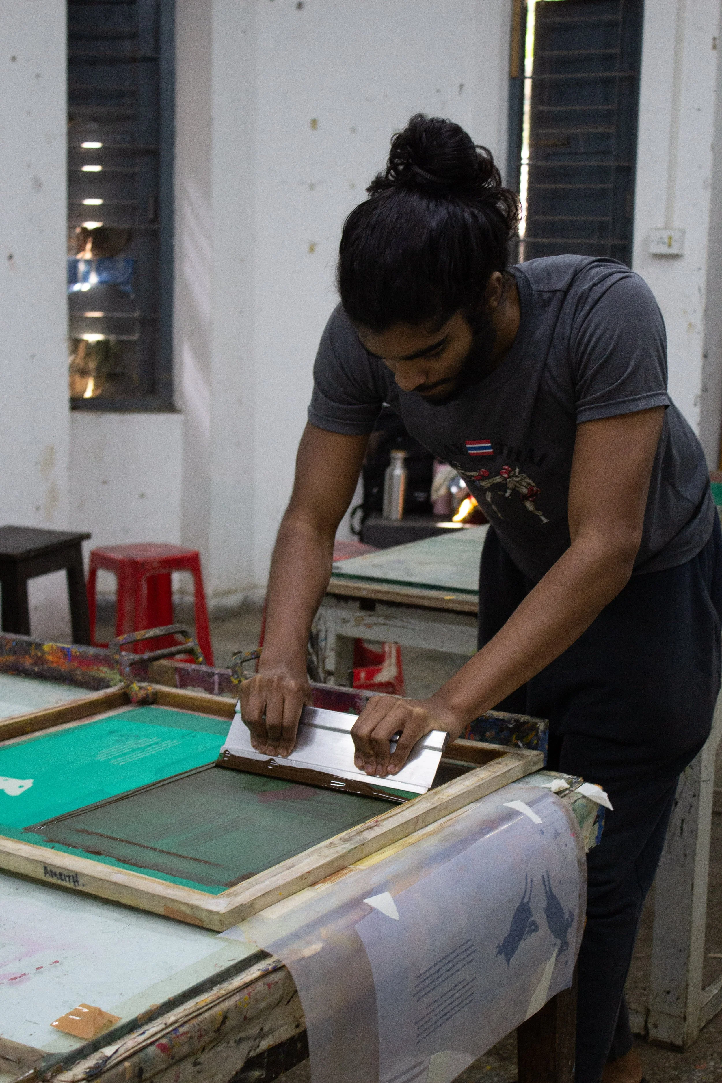 During our 3-week stay in India, graciously hosted by Santiniktean Society of Visual Arts and Design, Amrith and I spent most of our days screen printing at Visva Bharati University, surrounded by cows, banyan trees, and mosaic-covered buildings.