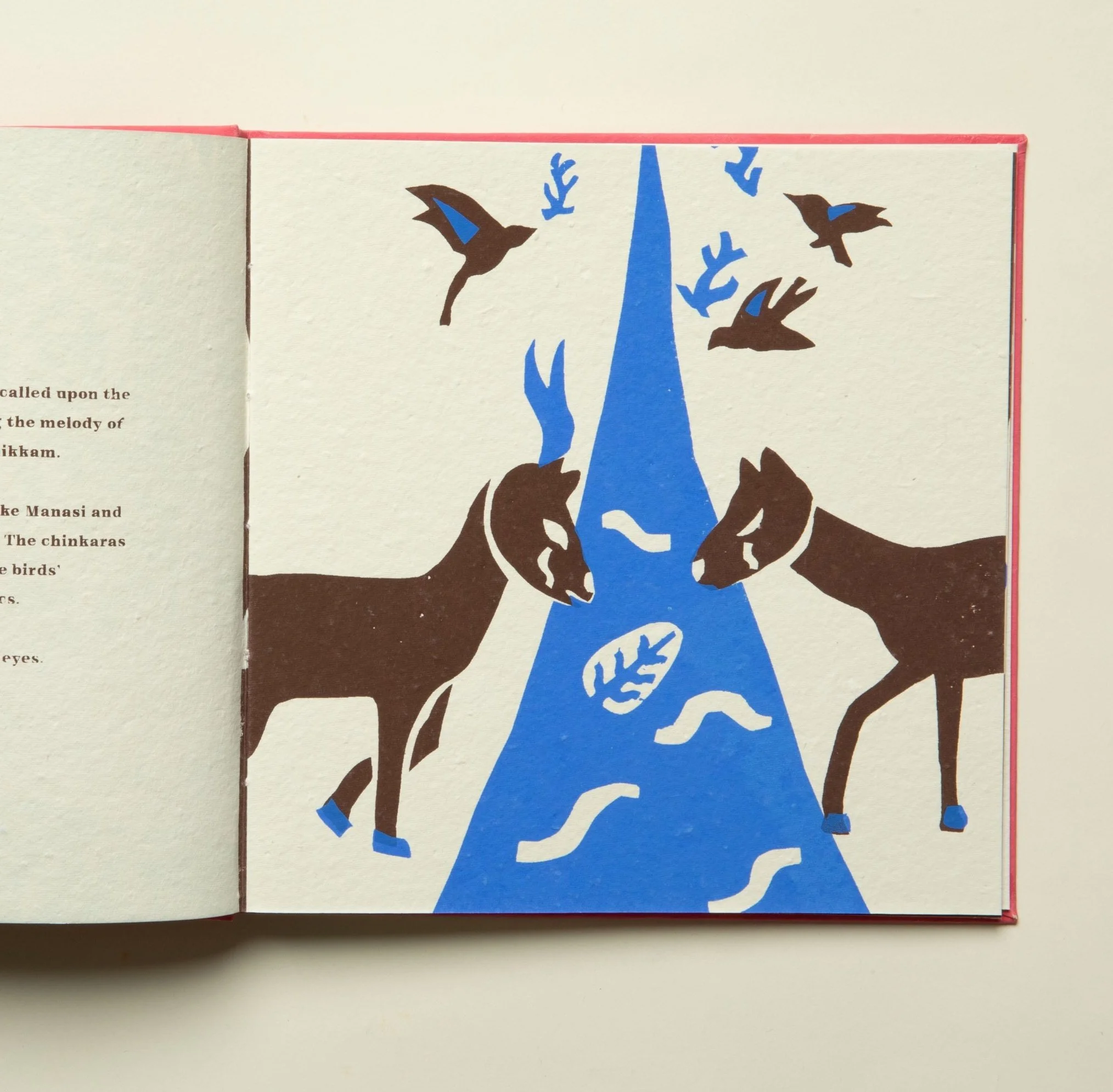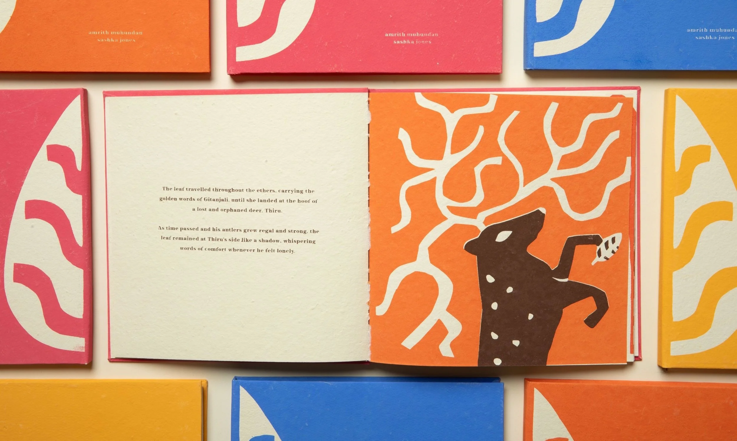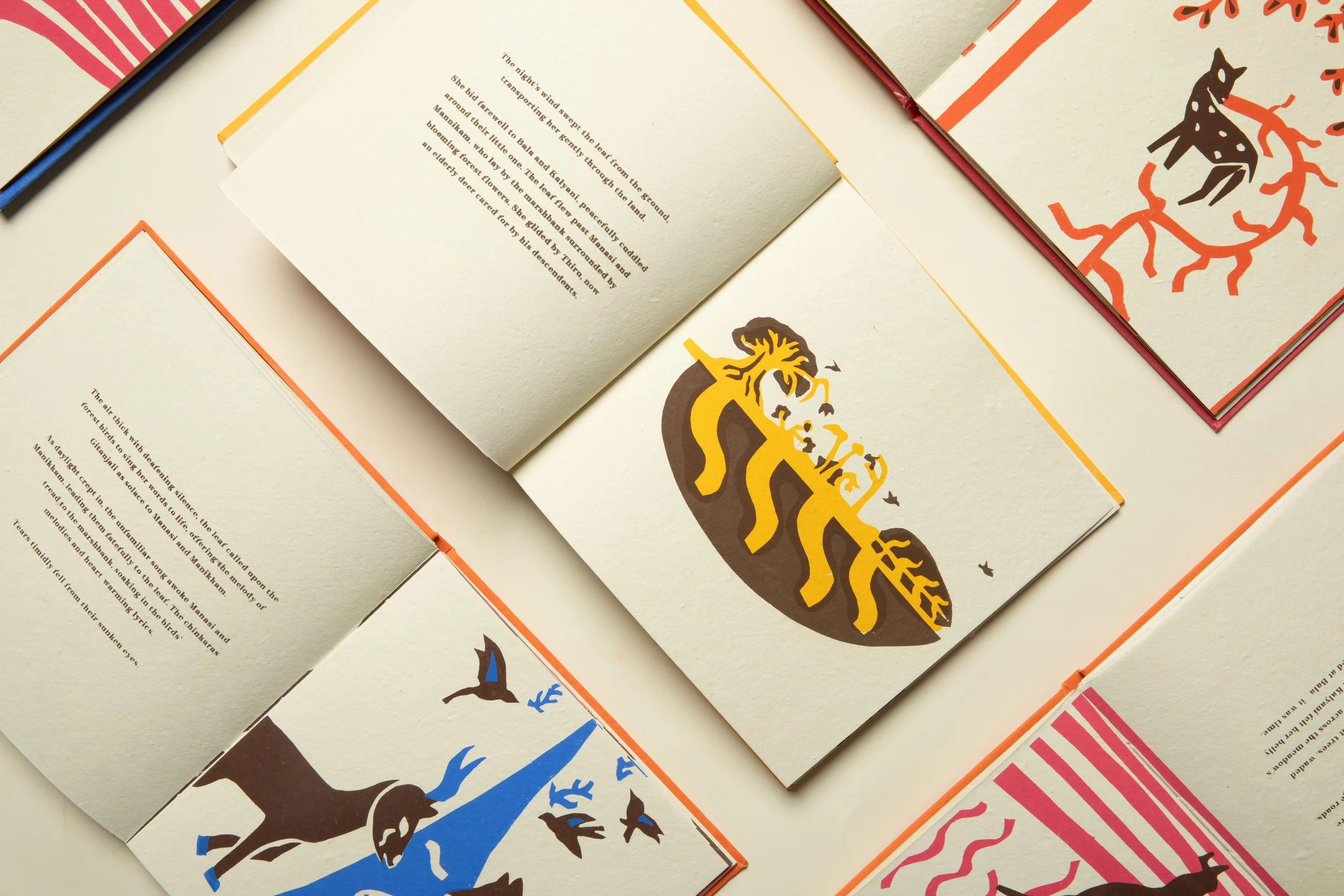 Every inch of the book is completely handmade, from the writing to silkscreen printing to bookbinding, by myself and Amrith Muhundan. Upon receiving funding from Central Saint Martins (University of Arts London), we were fortunate enough to bring this book to life in Santiniketan, India, at the exact arts school which Tagore established in early 20th century.