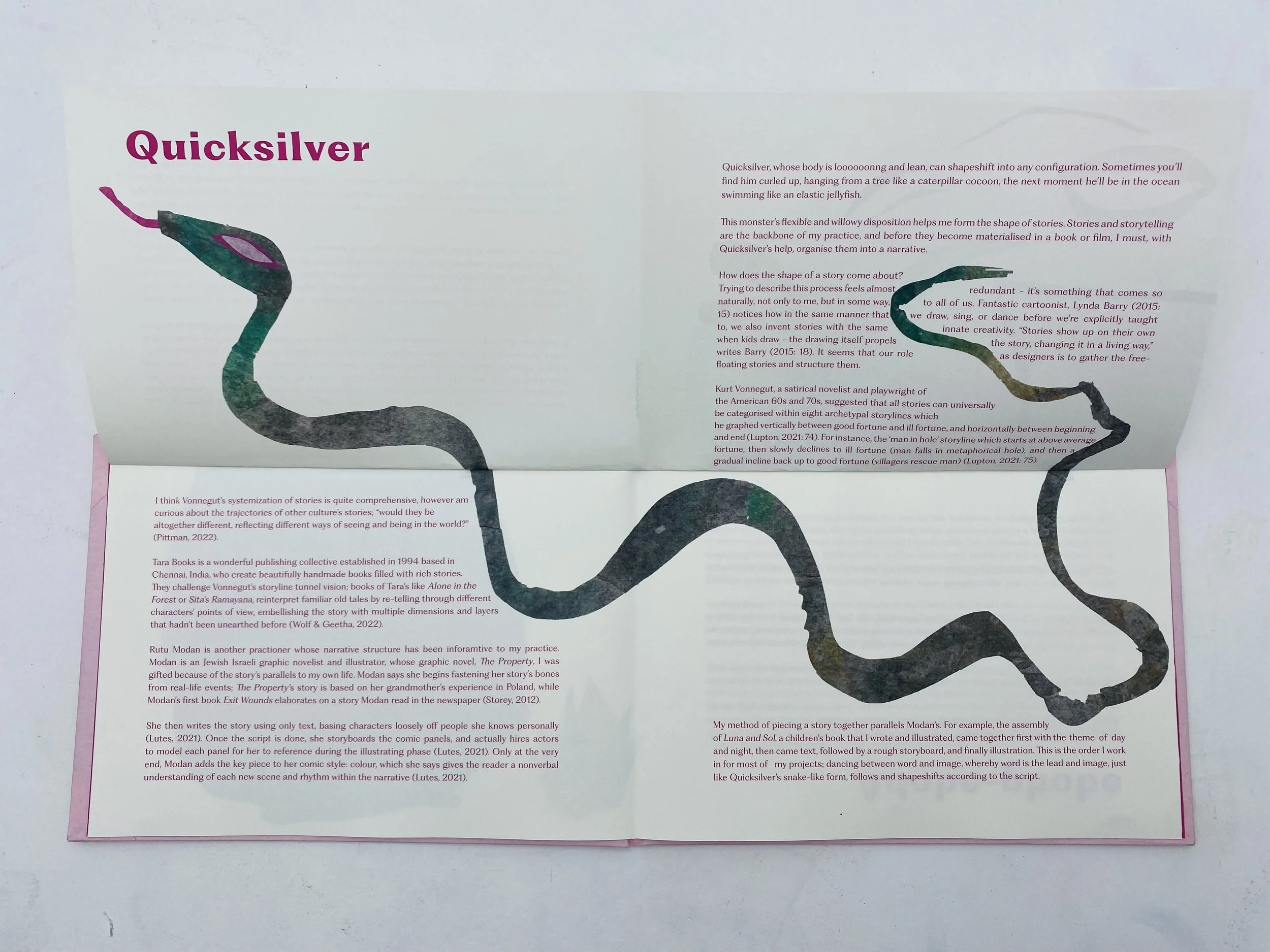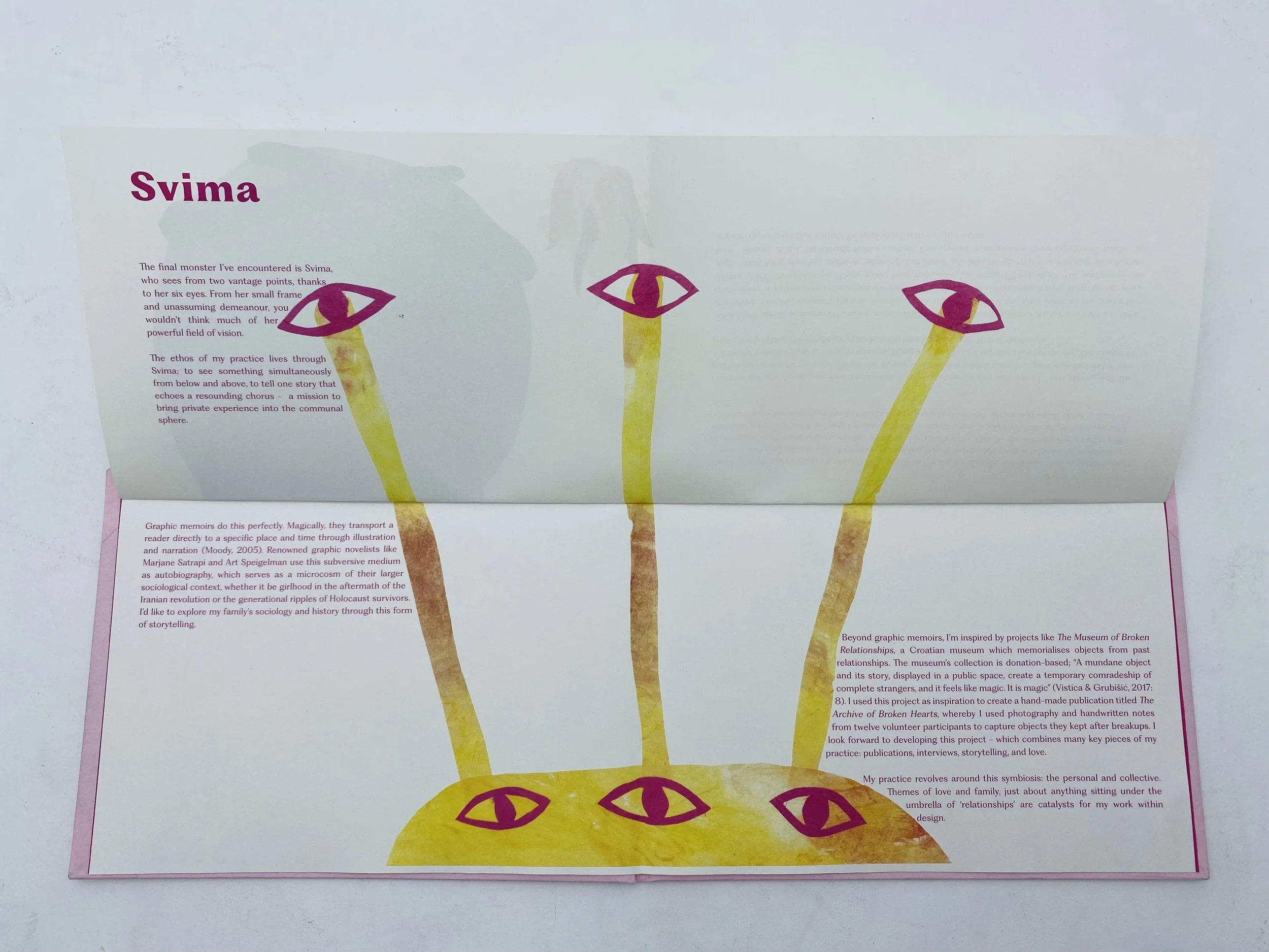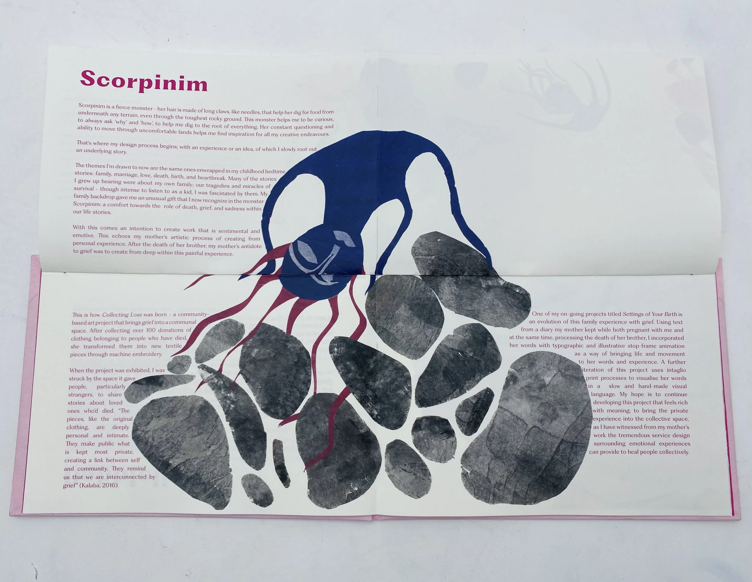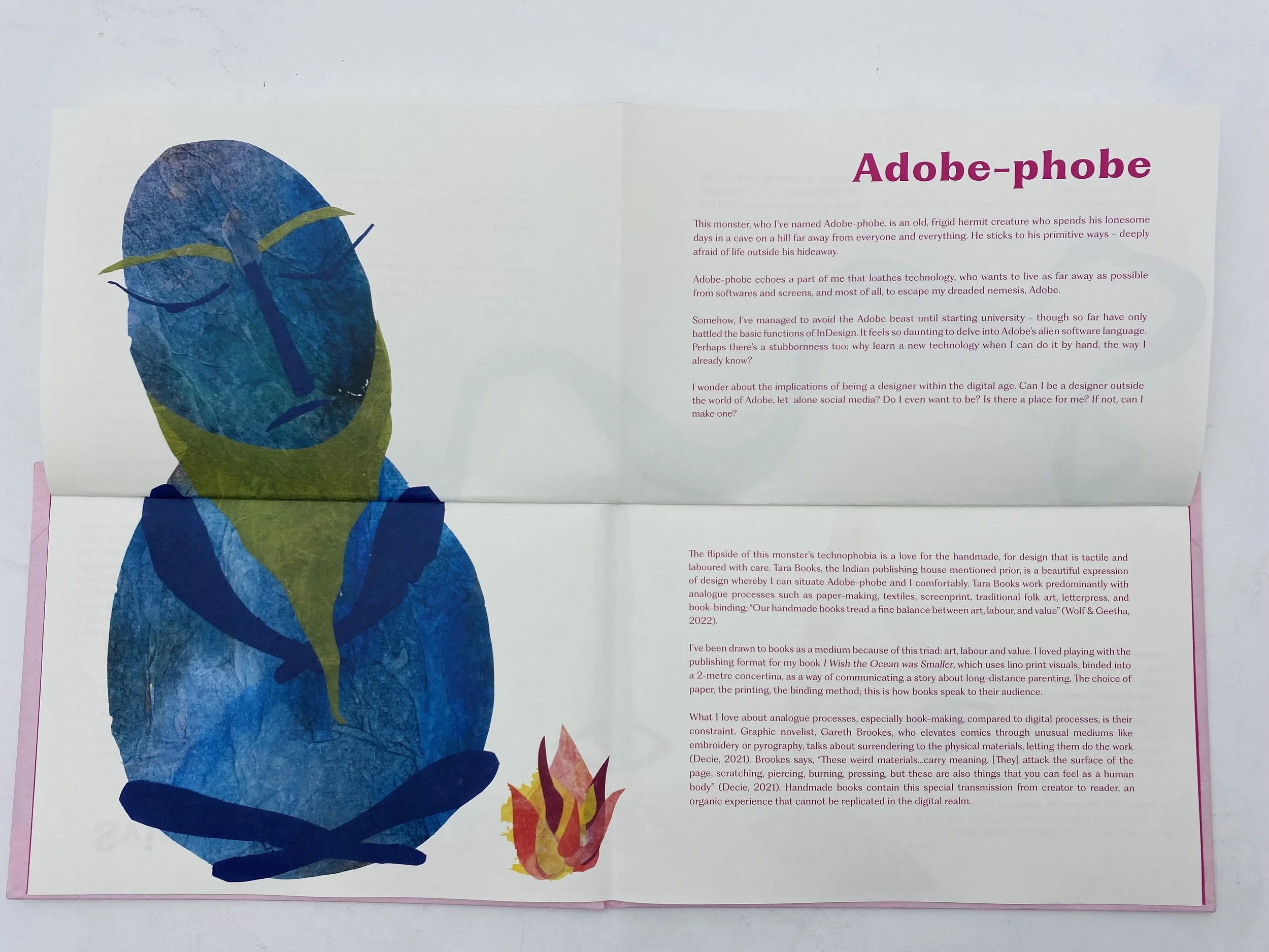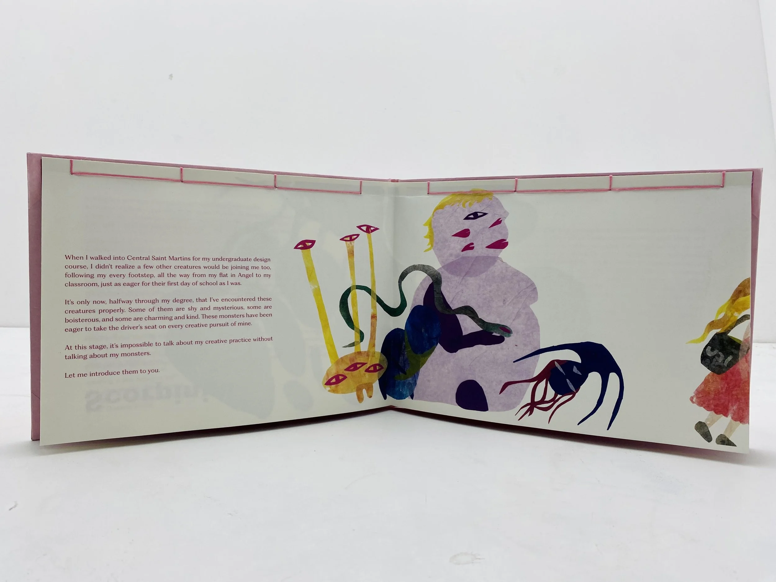 This hardcover publication imagines my creative practice as five monsters: Scorpinim, Babblelina, Quicksilver, Adobe-phobe, and Svima. The monsters take shape through hand-dyed tissue paper and collage, and are brought to life by my own reflective writing. The publication itself is an act of child-like discovery; bound horizontally, the book opens vertically, curiously revealing the monsters who lurk between the pages.