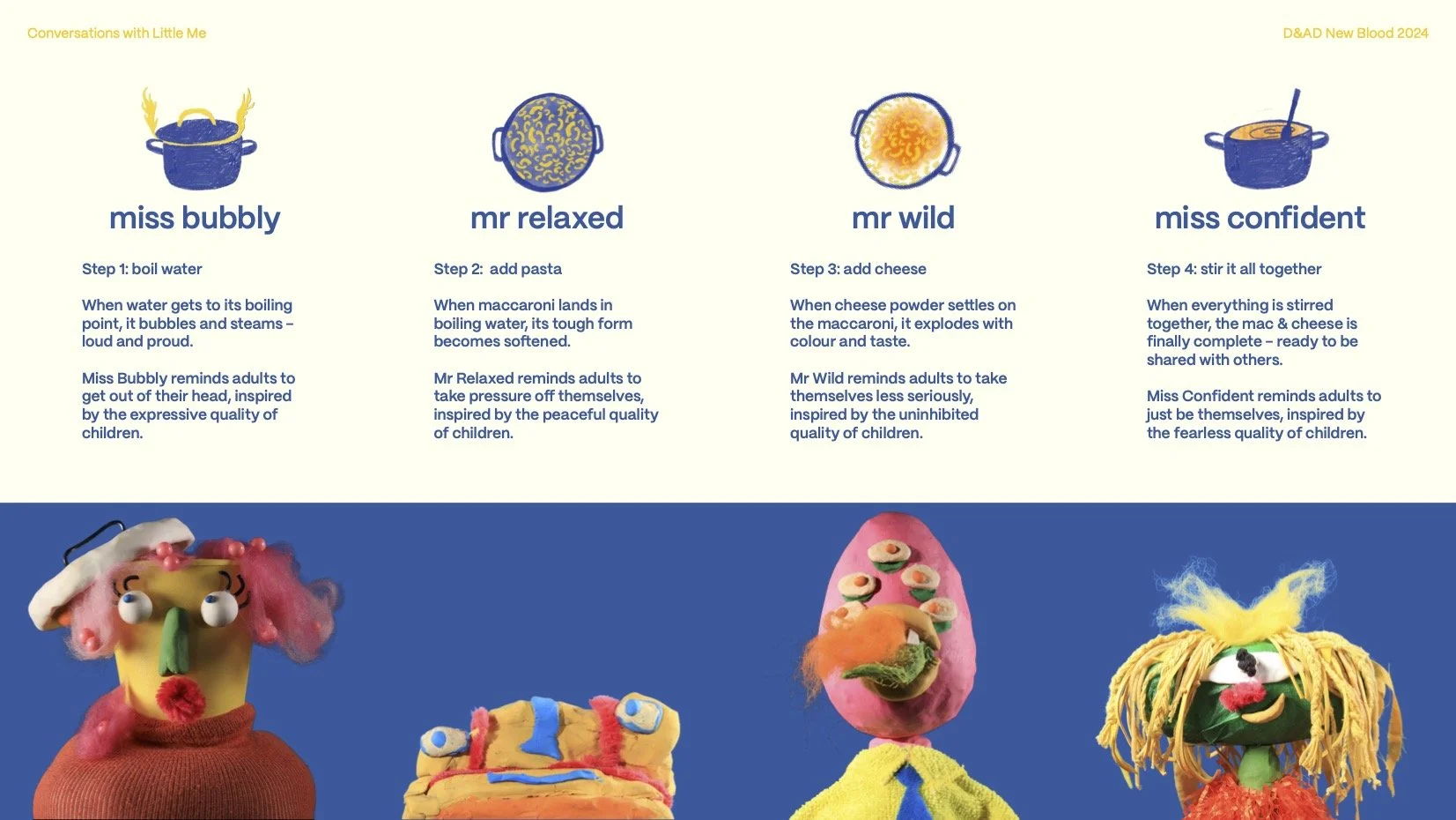 In this stop-motion animation series, the four easy steps of making mac & cheese are each transformed into a playful creature connected to an essential childhood quality: bubbly, relaxed, wild, and confident. This campaign hopes to empower young adults, connecting them with the innate childhood wisdom they may have lost along the way.