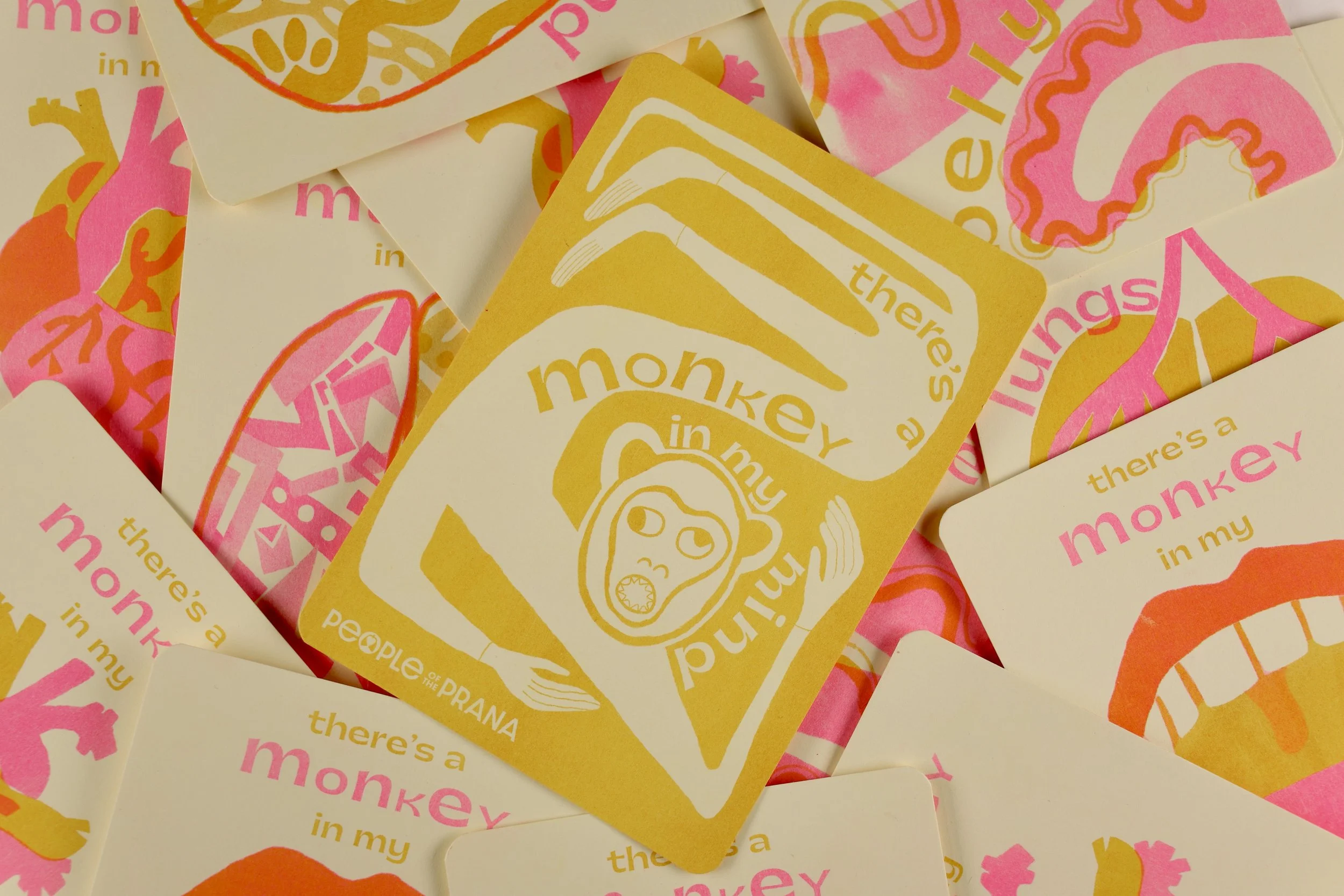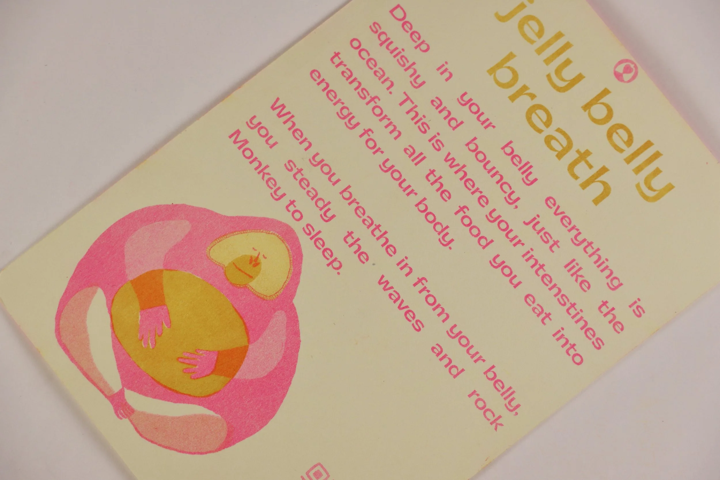 Each card presents a specific 3-minute breathing exercise, linked to an accompanying audio guide. Through dynamic illustrated visuals, printed using vibrant risograph inks, and brought to life by the boisterous Monkey character, these cards are designed to capture children’s restless energy, and help them find a little calm.